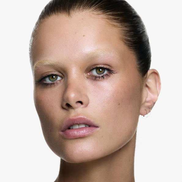 Un maquillage sophistiqué qui joue sur le contraste d'un teint naturel avec des cils audacieux.